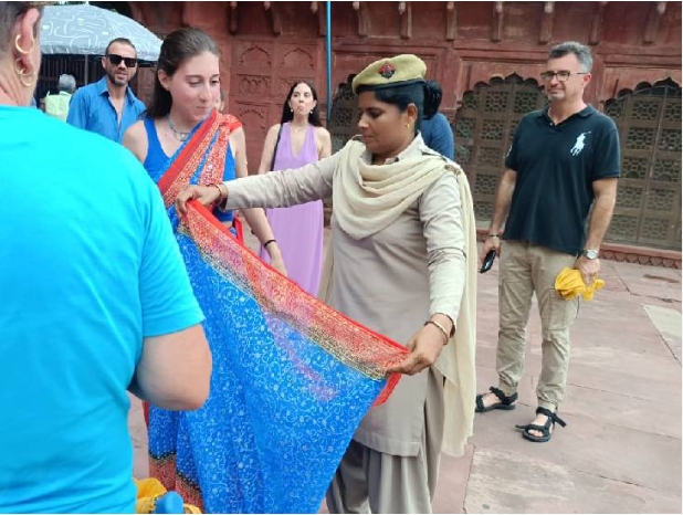 इस स्थिति को देख वहां तैनात एक महिला सुरक्षा कर्मी ने तुरंत उनकी मदद की। महिला सिपाही ने न केवल उनकी साड़ी ठीक ढंग से पहना दी, बल्कि उन्हें यह भी बताया कि साड़ी कैसे पहनी जाती है और किन बातों का ध्यान रखना चाहिए। यह छोटा सा दृश्य वहाँ मौजूद कई पर्यटकों के लिए एक सकारात्मक अनुभव बन गया।